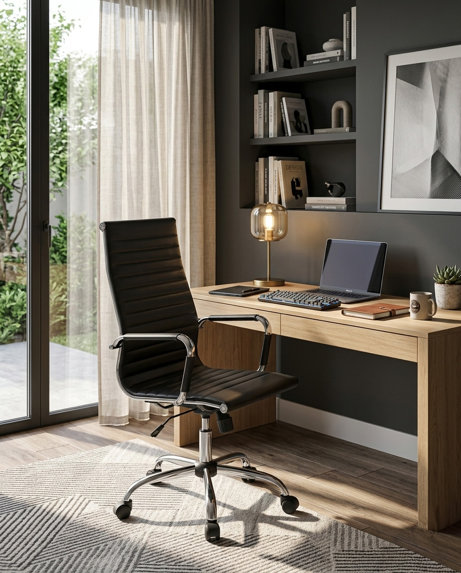 Bring a premium, professional look to your workspace with this sleek executive office chair. Designed with a high-back profile and horizontal ribbed padding, this chair delivers both style and comfort—perfect for modern offices, boardrooms, or home workspaces.