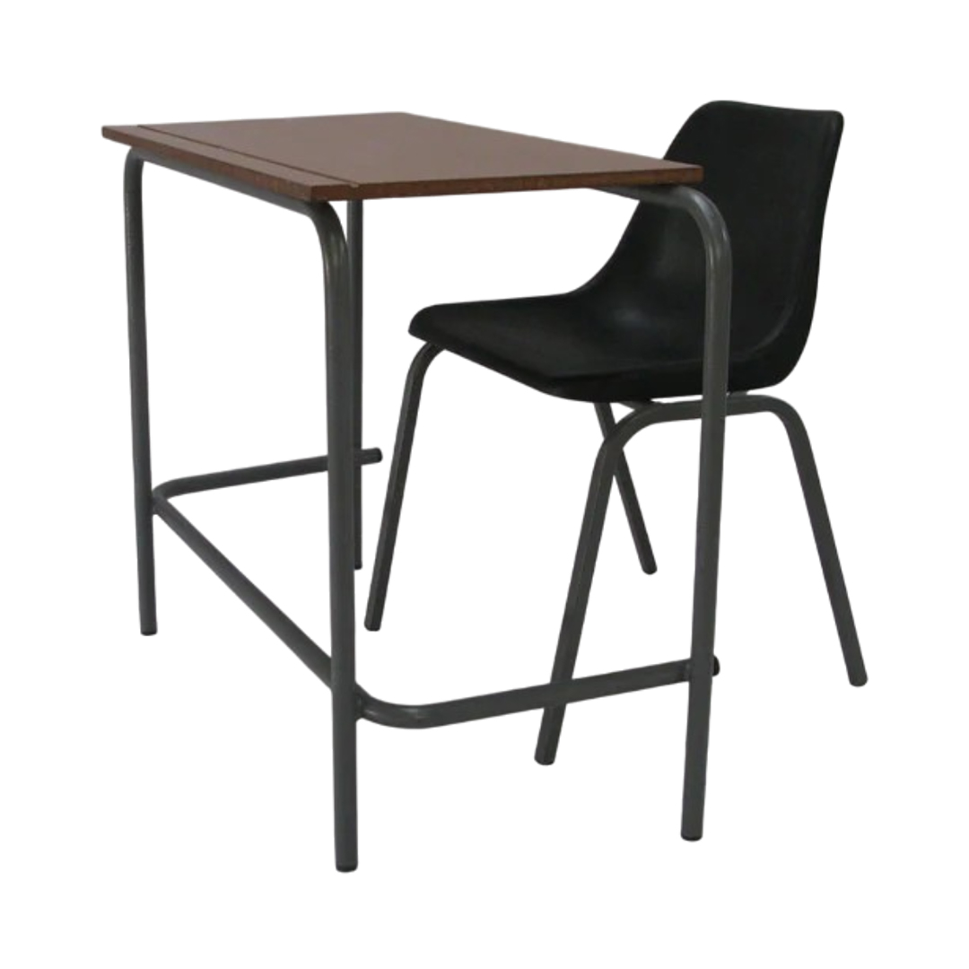 Senior Single School Desk – Sealed and varnished supawood/saligna top, mounted on a frame manufactured using powdercoated round tubing.